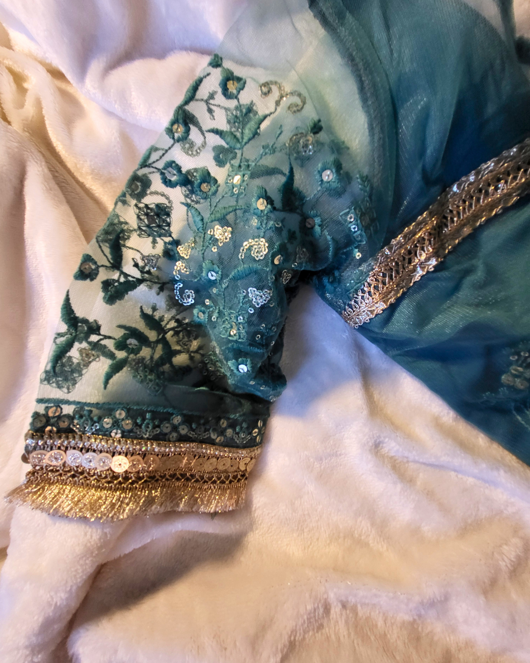 This dreamy net lehenga comes in a beautiful blue toned sea green colour, with embroidery all over and silver sequin work for a touch of sparkle. Our favourite part of this lehenga is the blouse, with netting for the arms and the shoulders giving you that desi mermaid look.