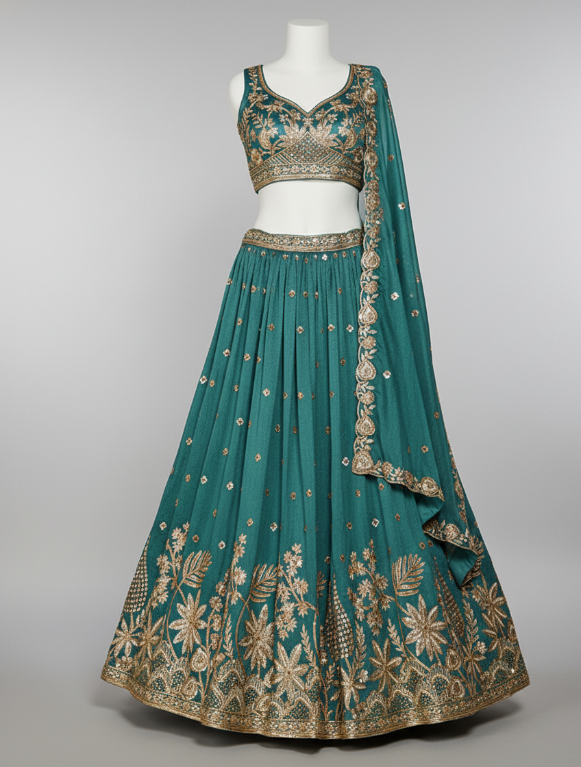 This gorgeous teal lehenga features gold embroidery throughout and is made of chiffon. Attached to the skirt is a ready made can-can, perfect for all the twirling and volume!