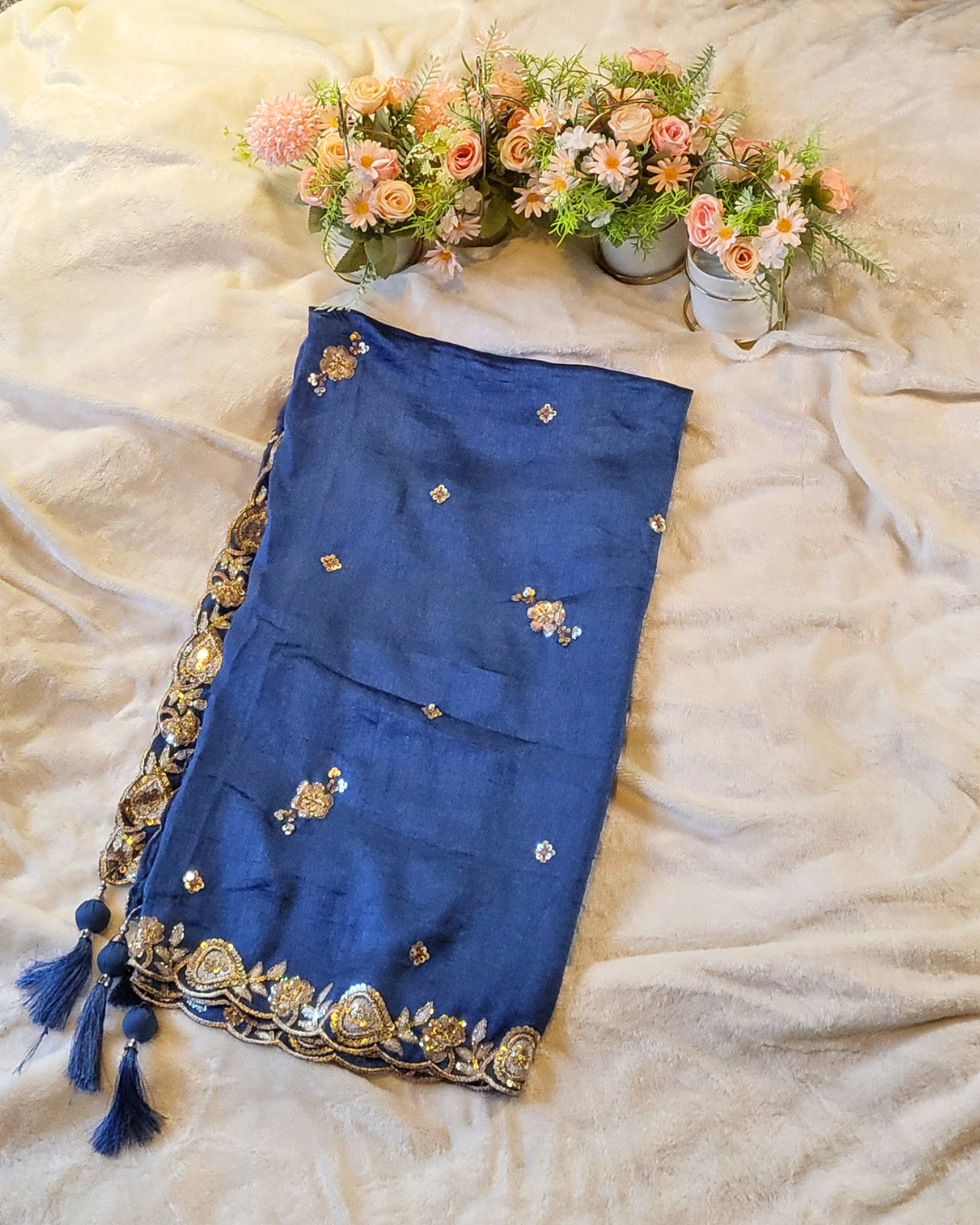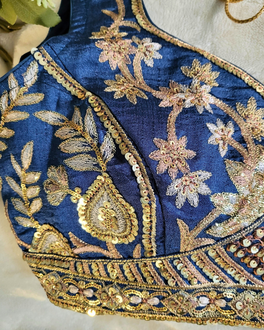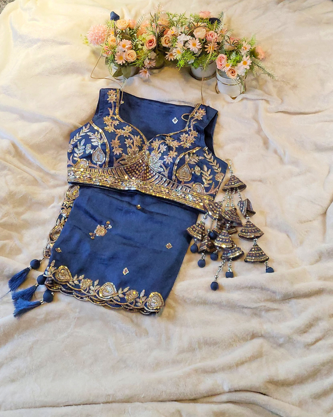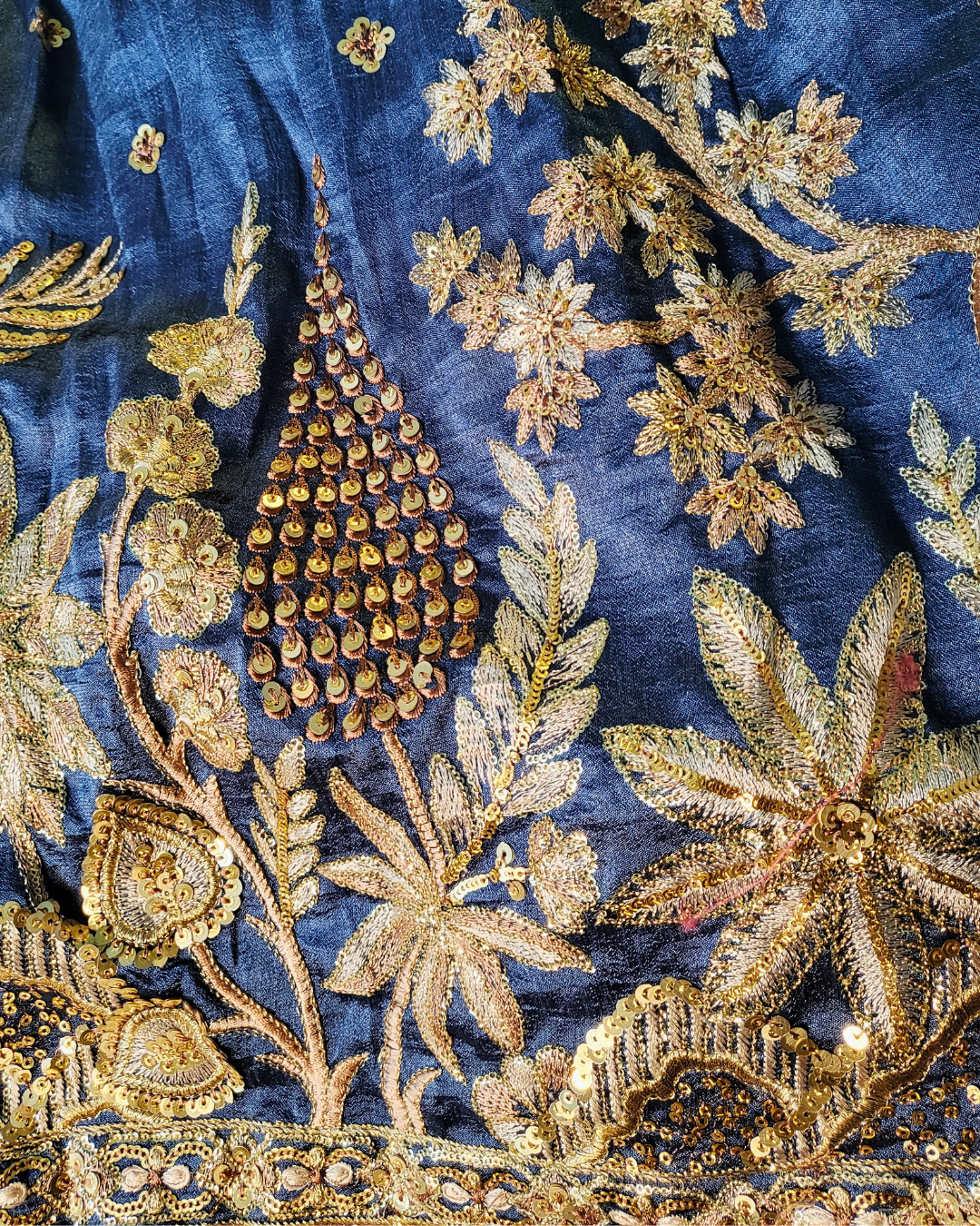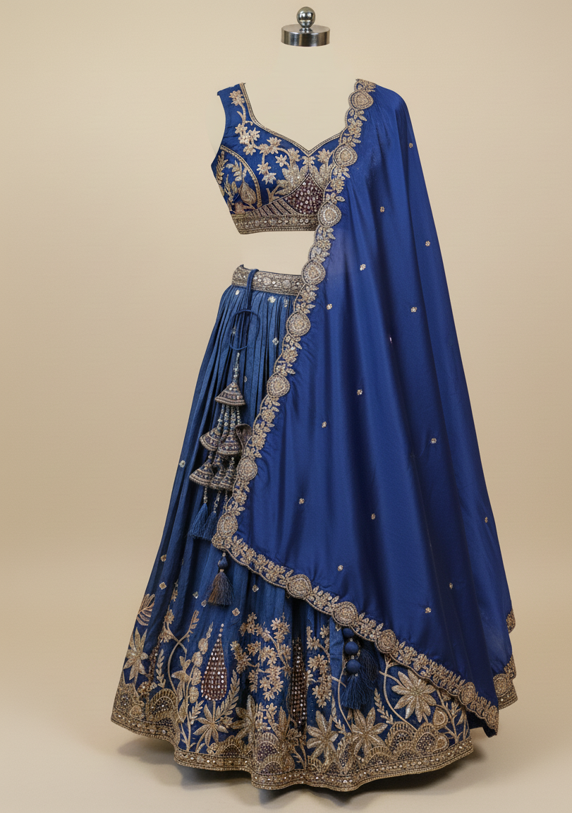 This beautiful blue lehenga features gold embroidery throughout and is made of chiffon. Attached to the skirt is a ready made can-can, perfect for all the twirling and volume!
