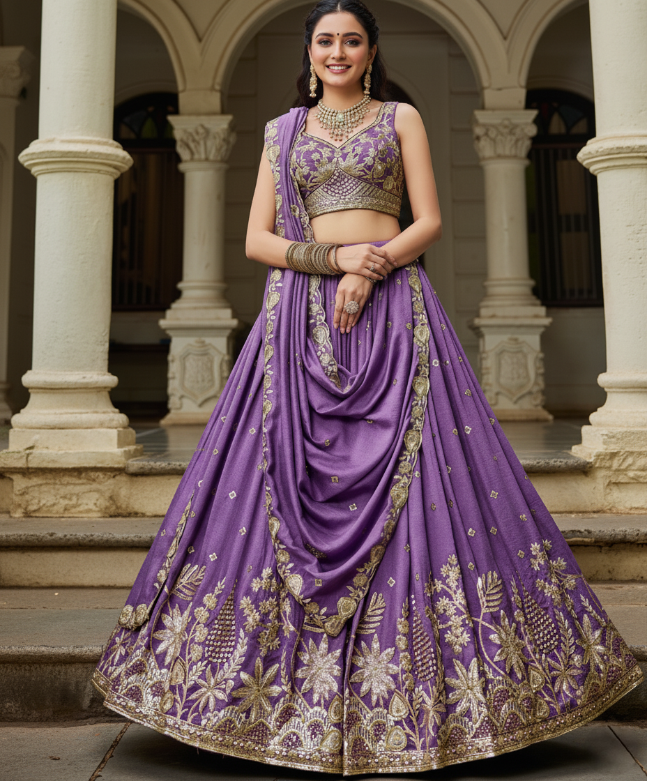 This lehenga features gold embroidery throughout and is made of chiffon. Attached to the skirt is a ready made can-can, perfect for all the twirling and volume!